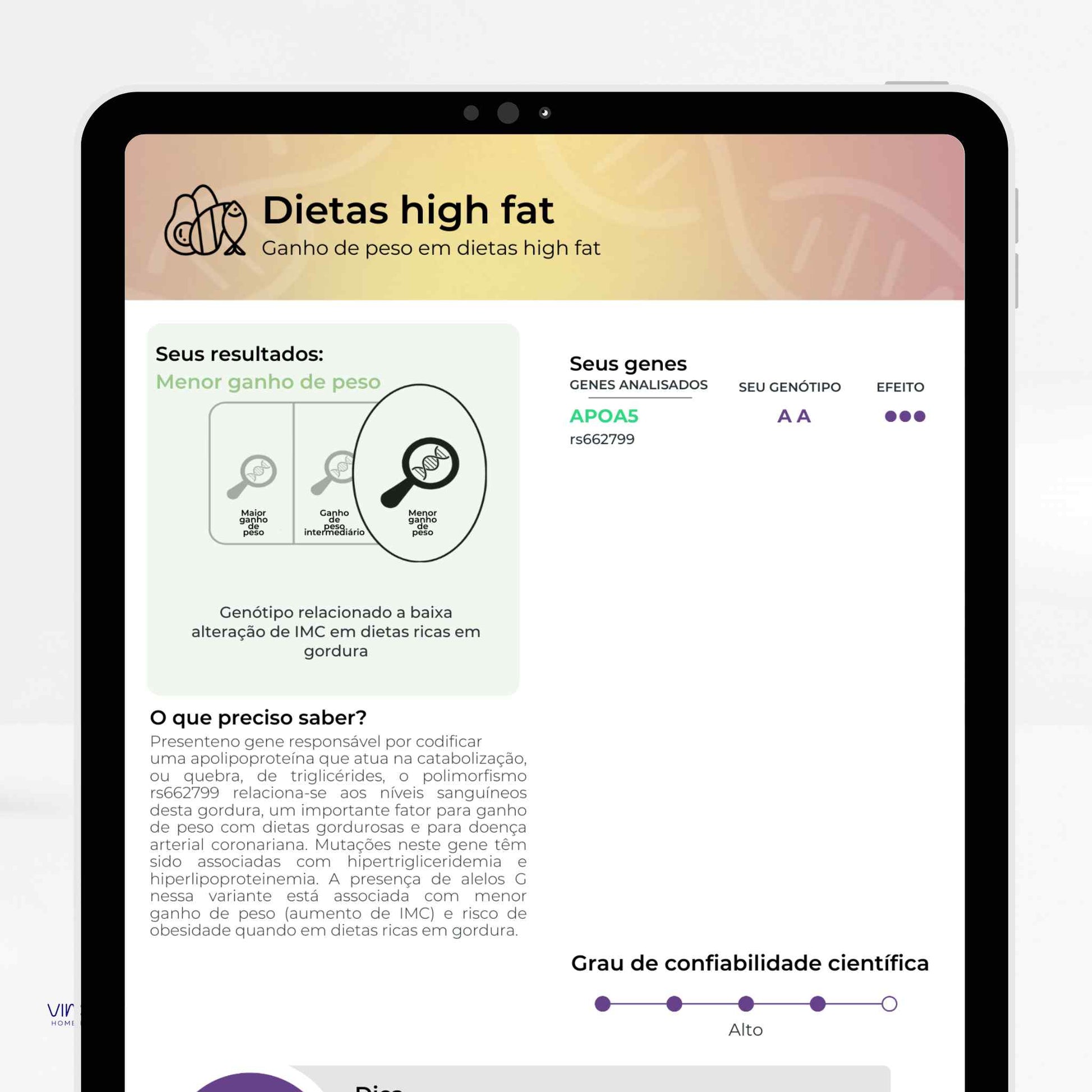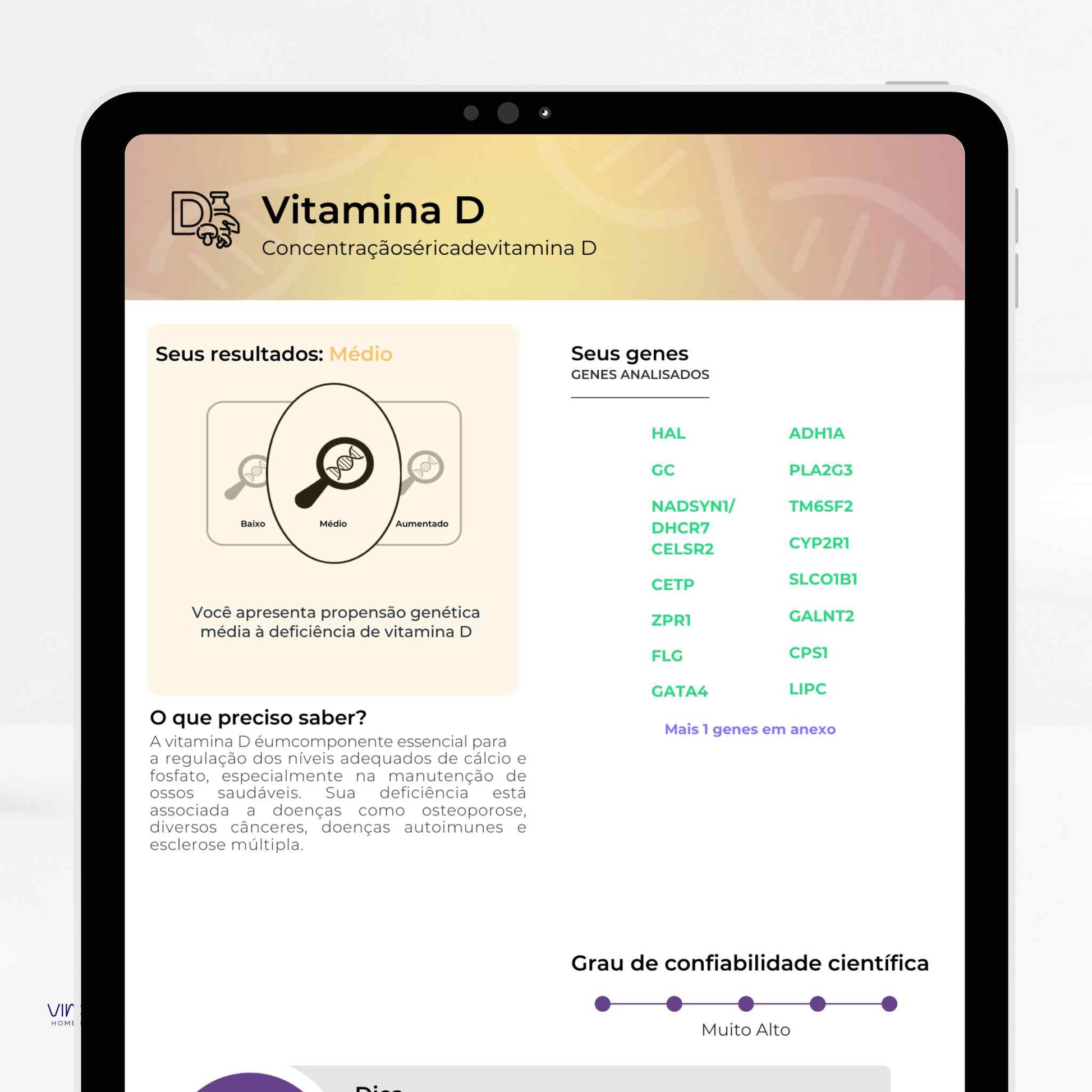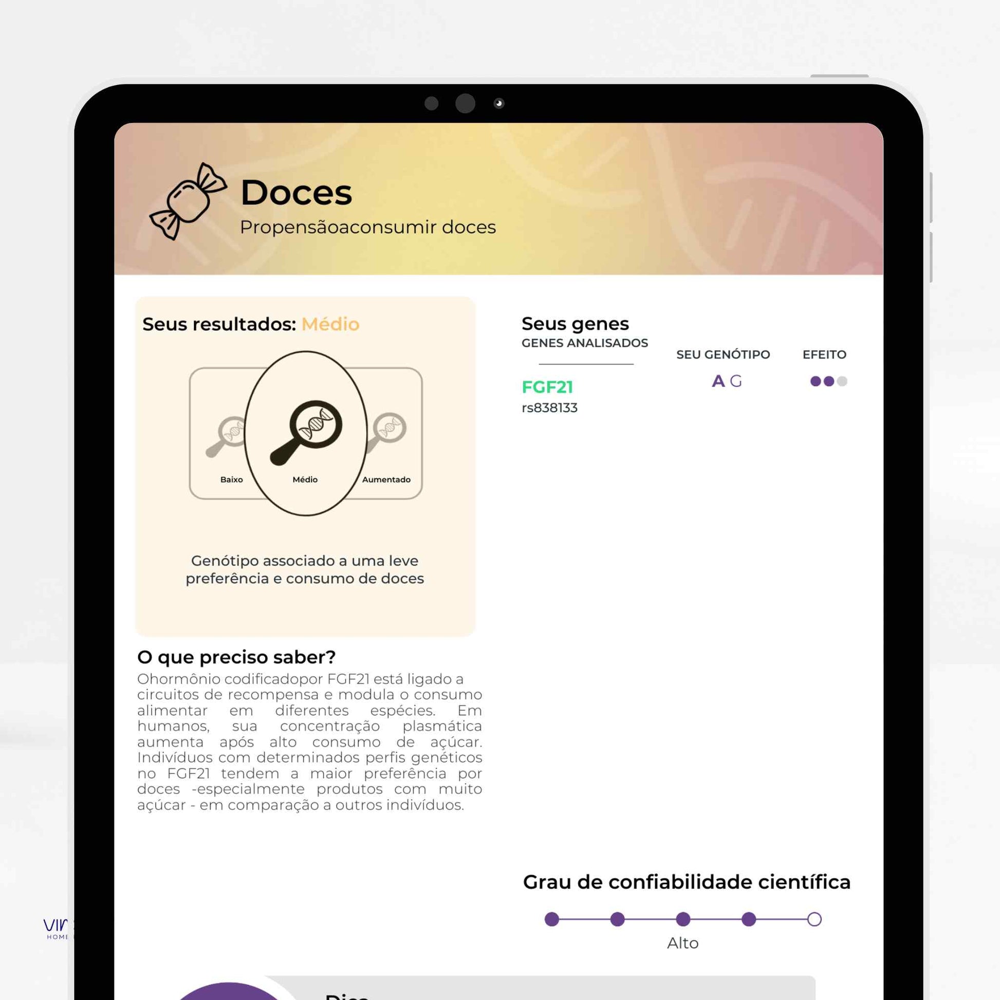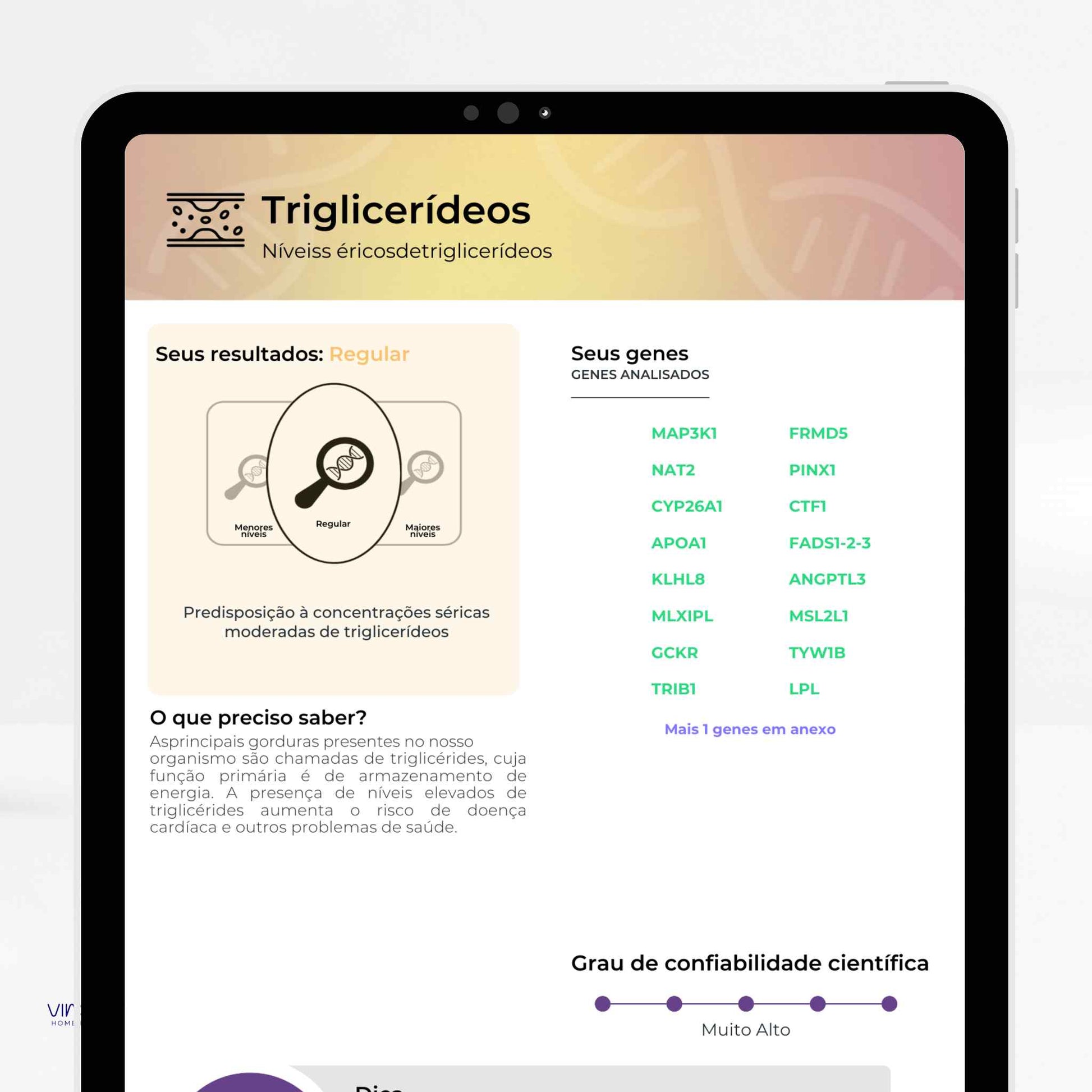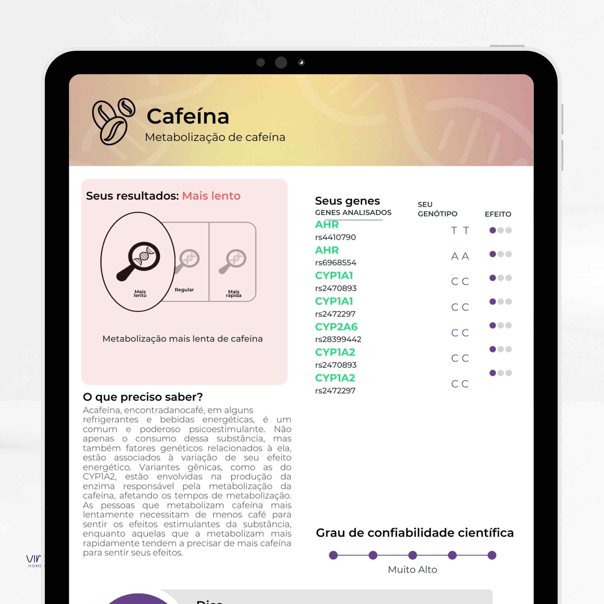 Analisa variações do seu DNA para oferecer informações sobre nutrição, metabolismo, performance física, saúde mental,...