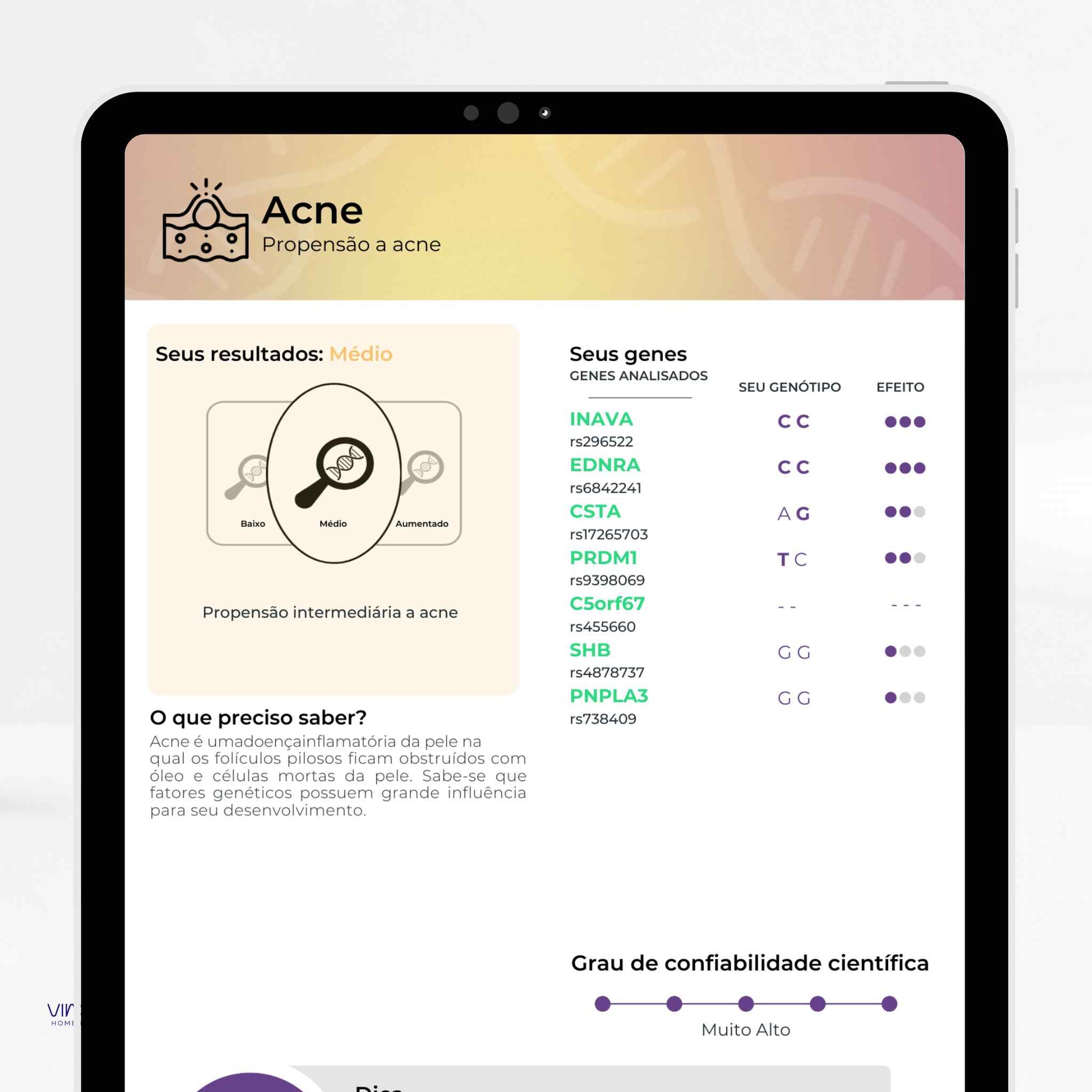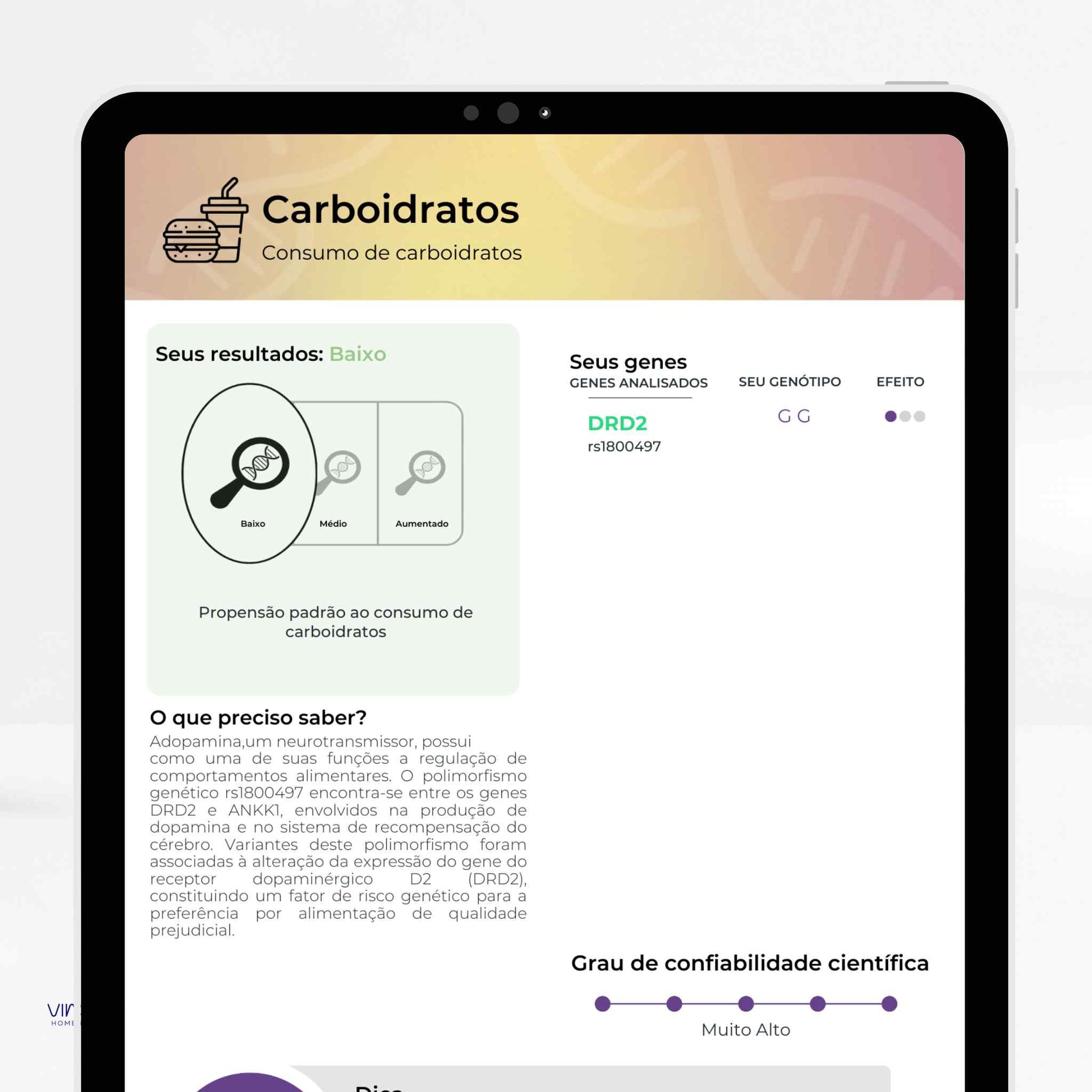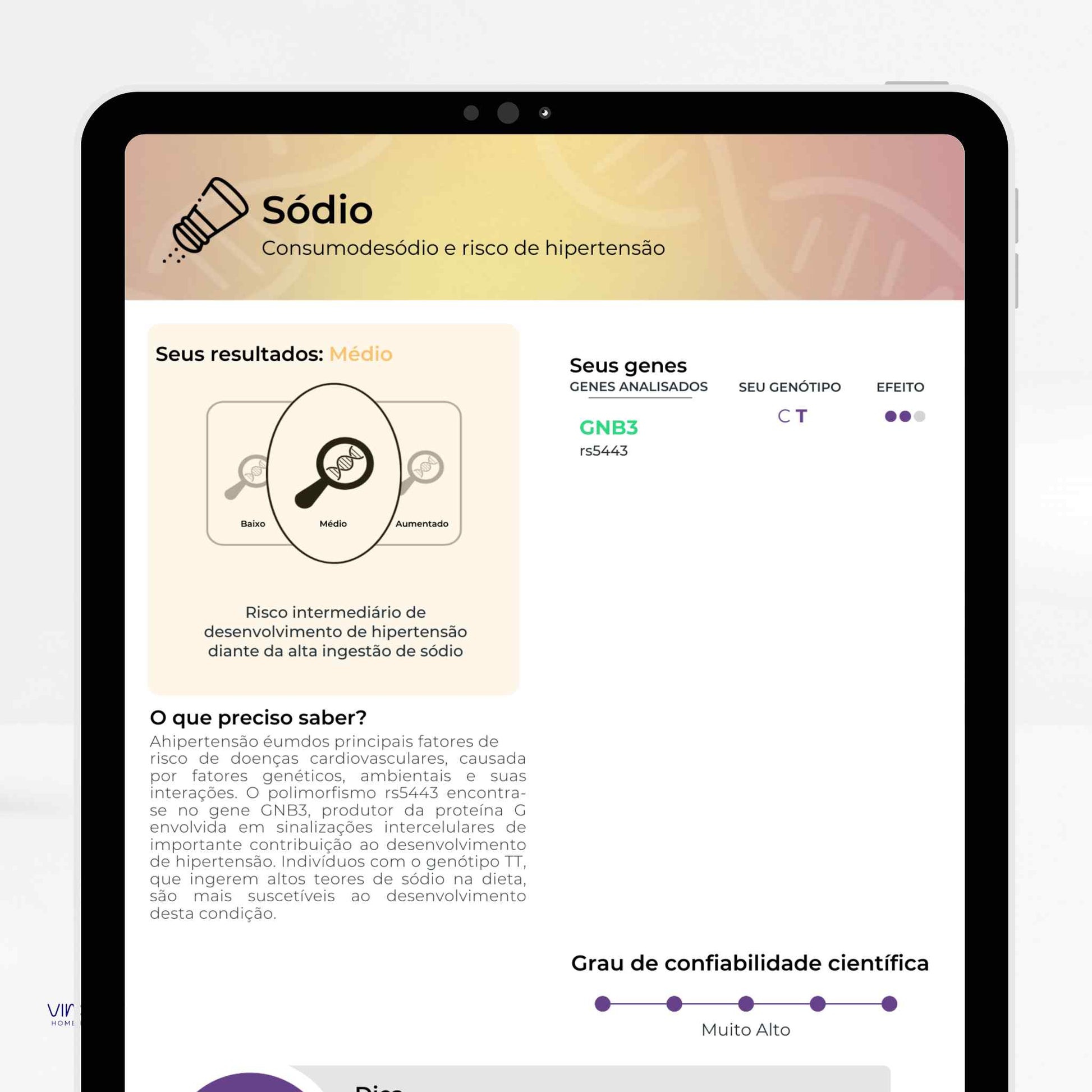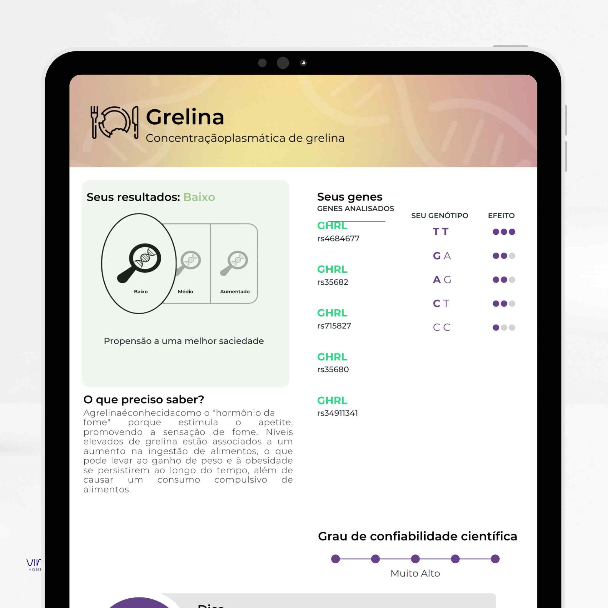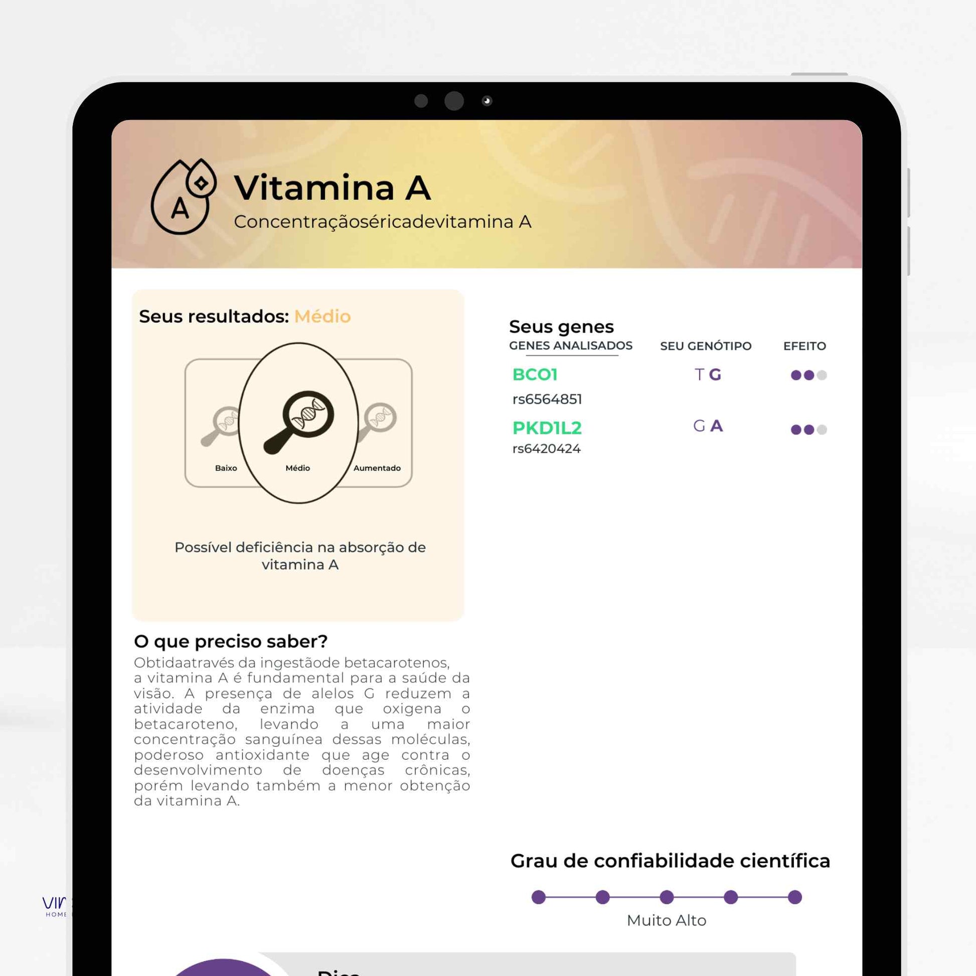 Analisa variações do seu DNA para oferecer informações sobre nutrição, metabolismo, performance física, saúde mental,...