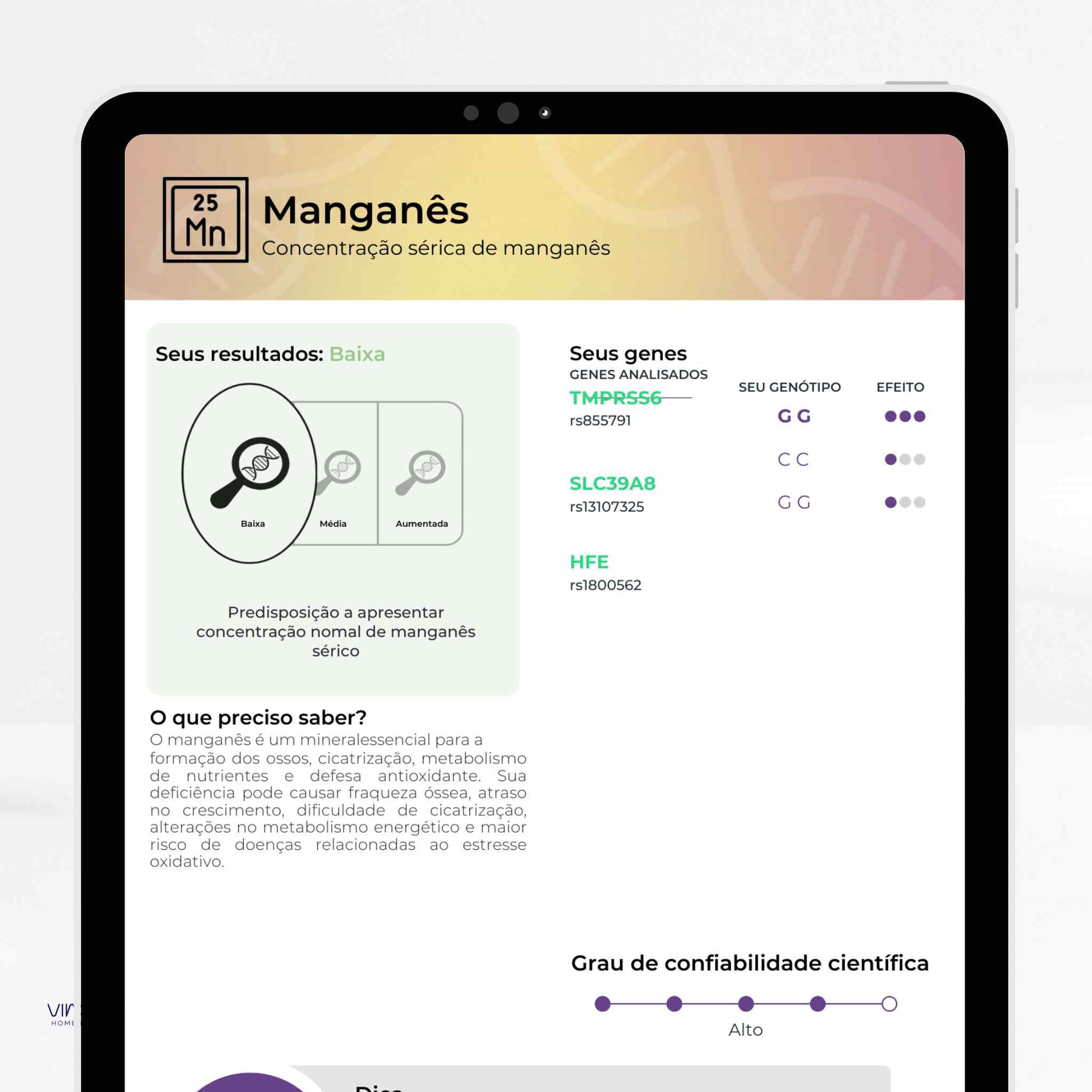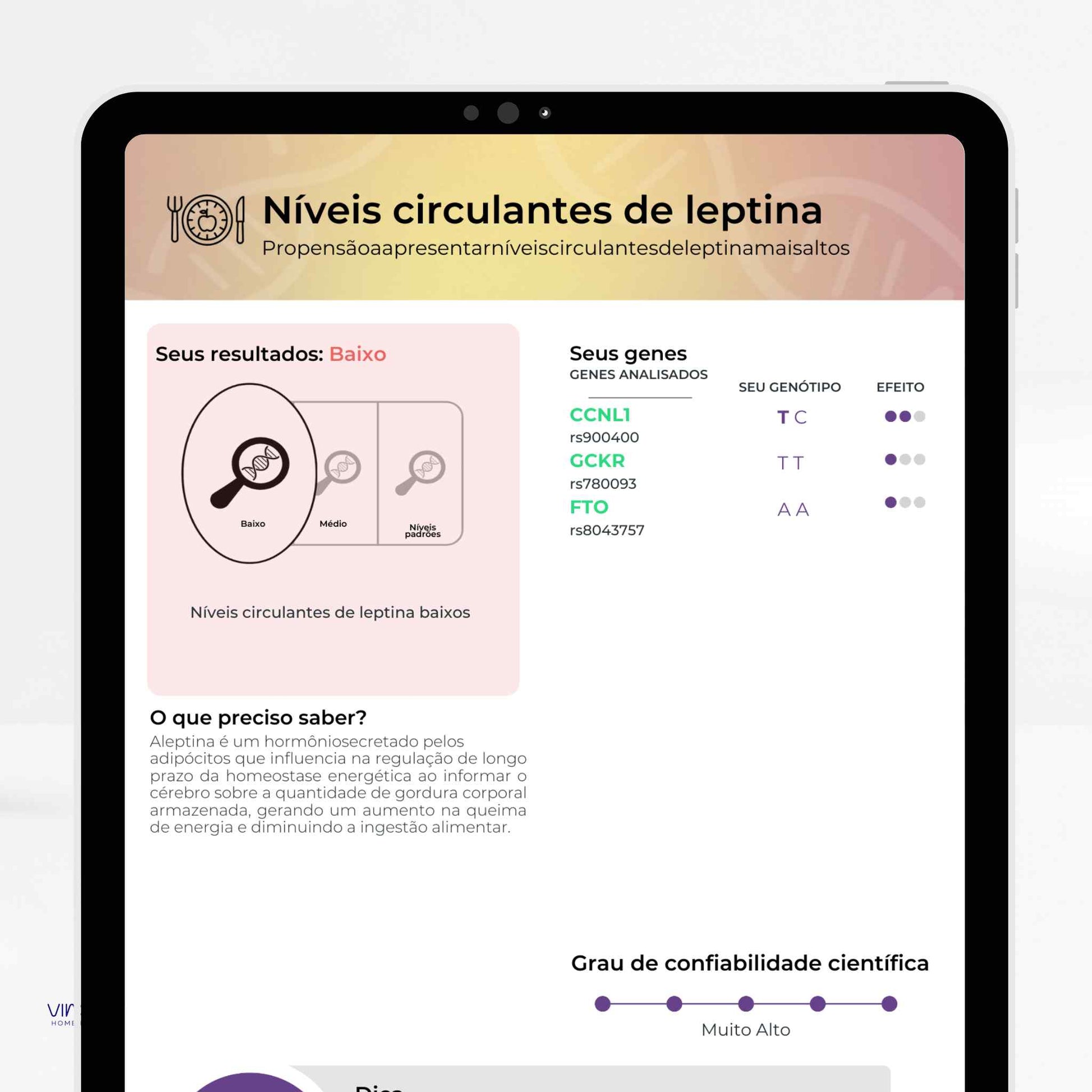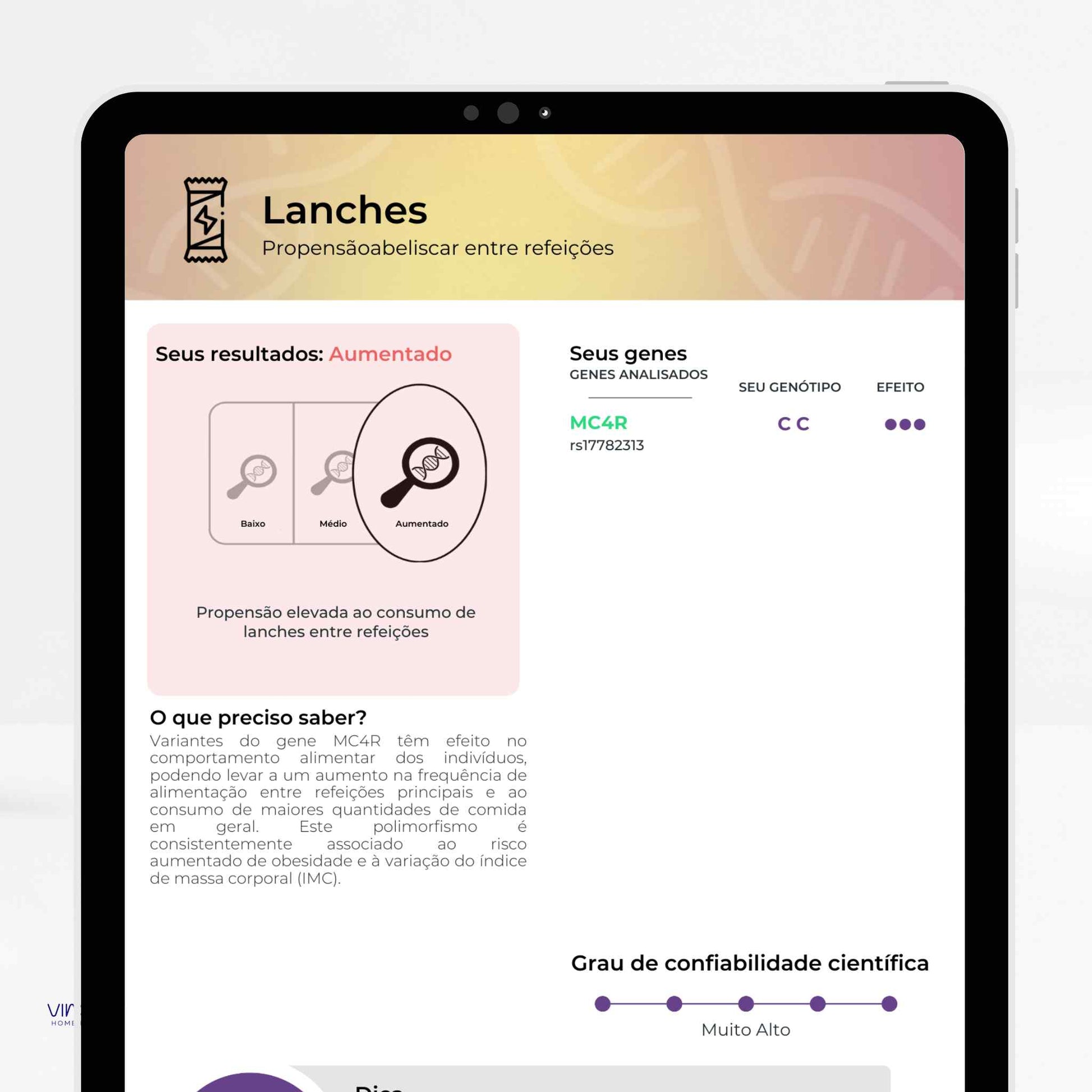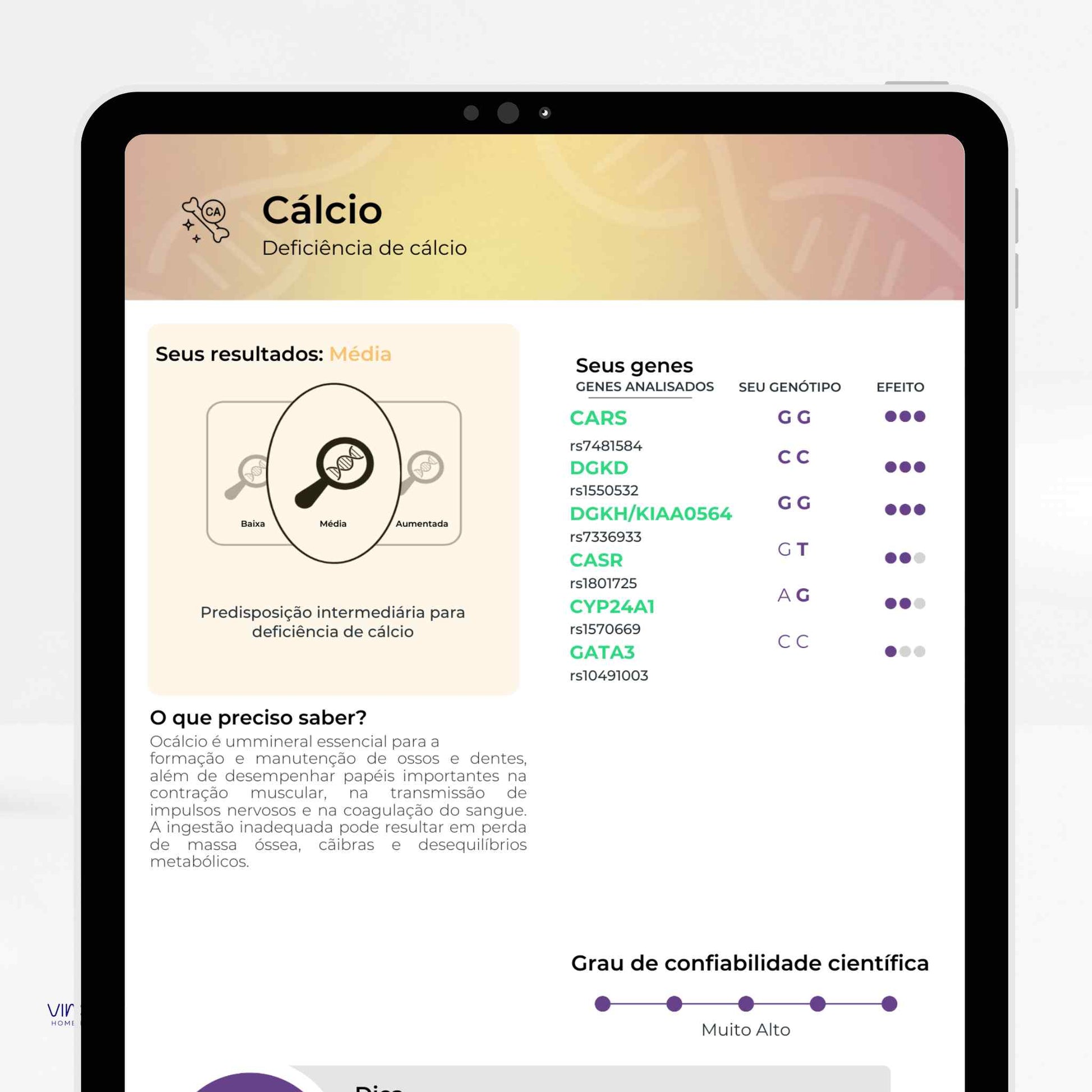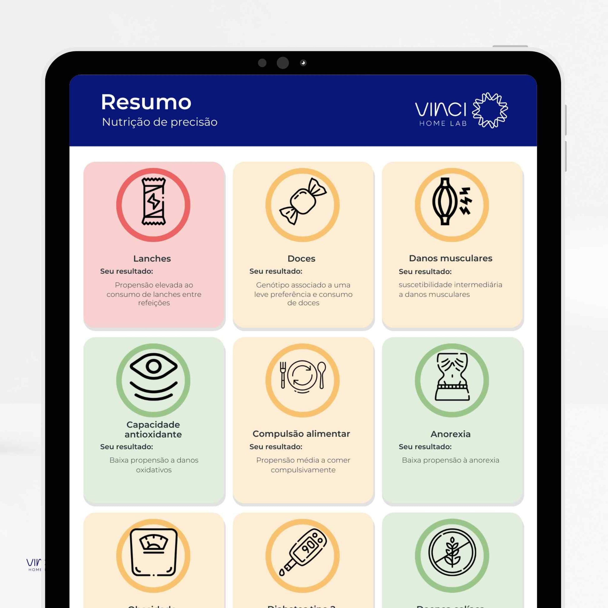 Analisa variações do seu DNA para oferecer informações sobre nutrição, metabolismo, performance física, saúde mental,...