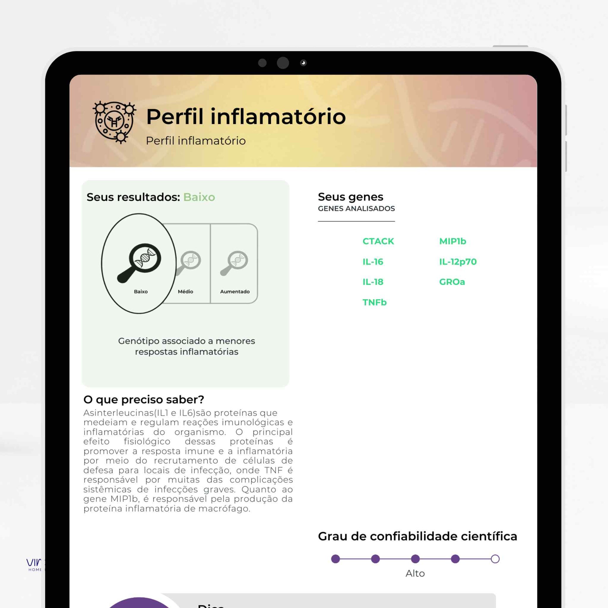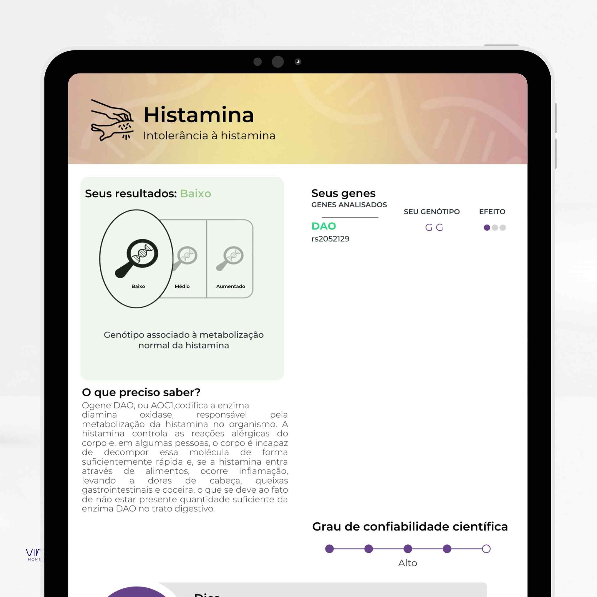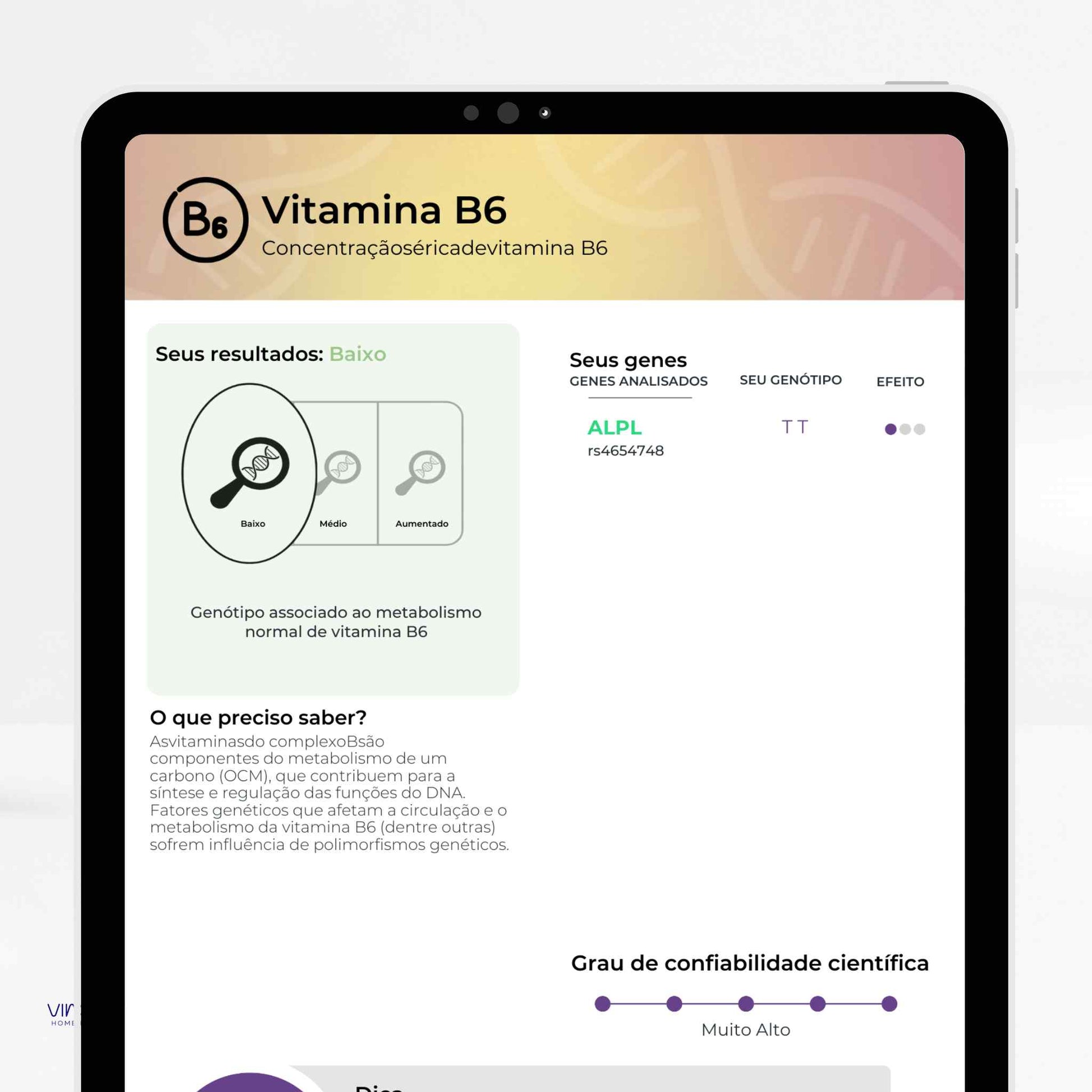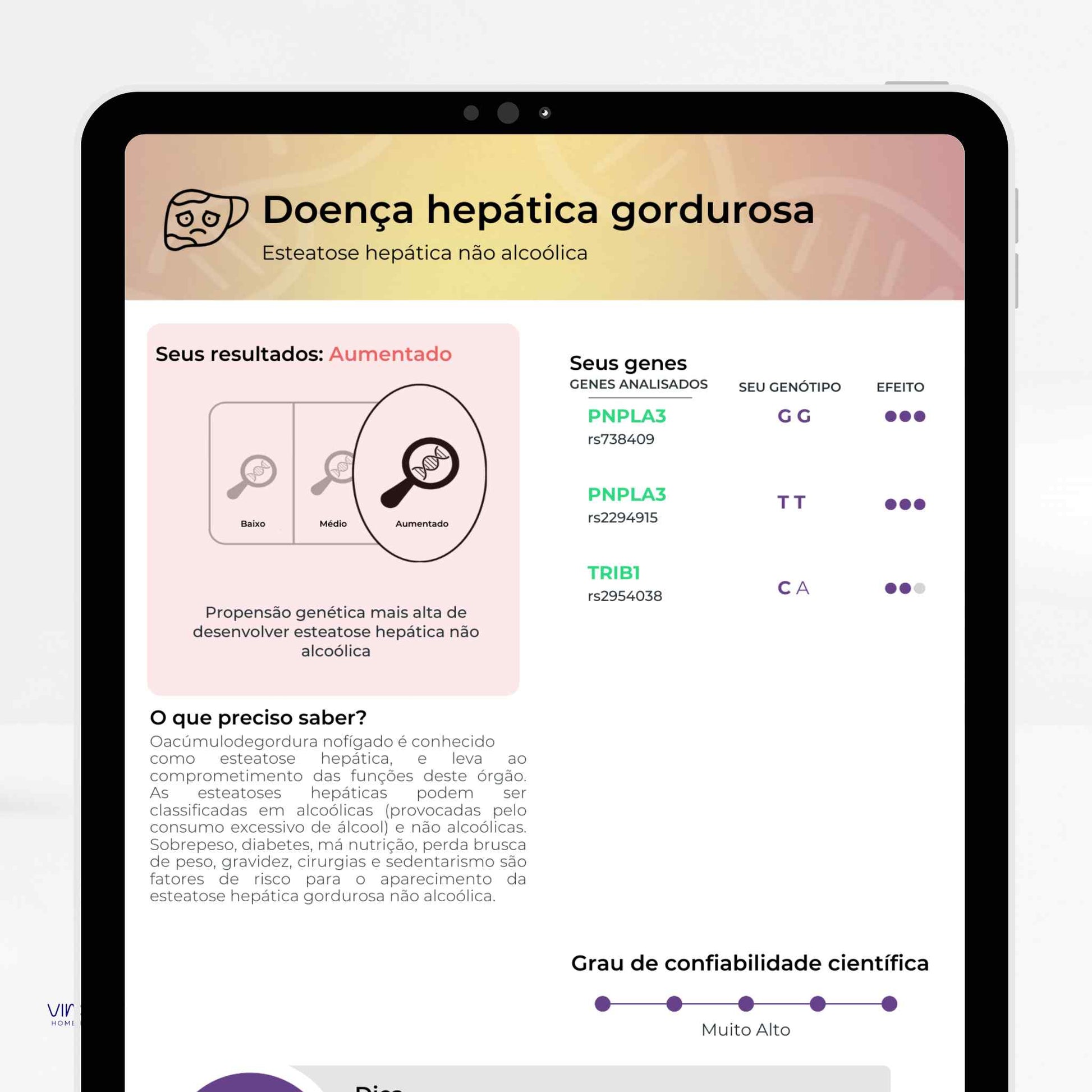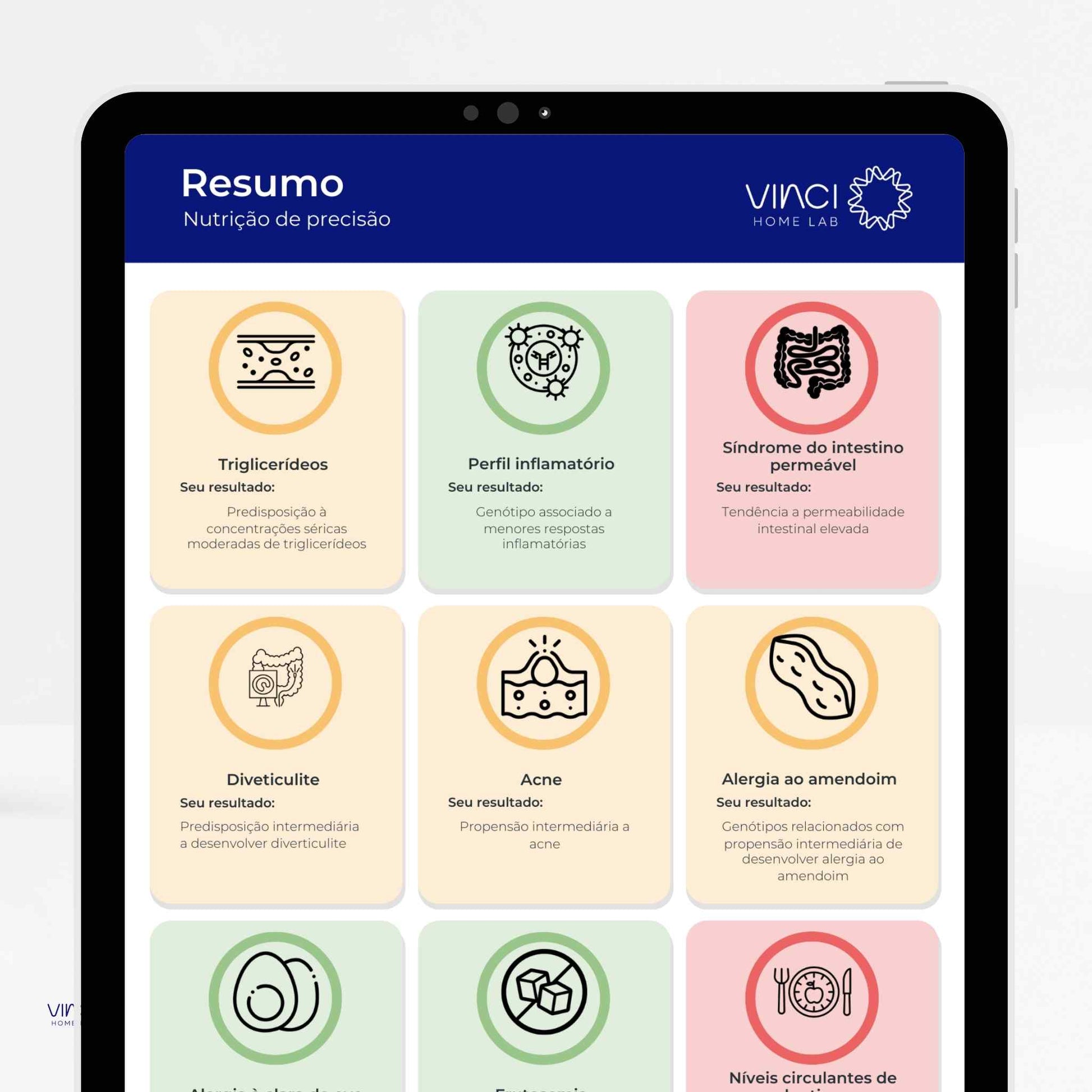 Analisa variações do seu DNA para oferecer informações sobre nutrição, metabolismo, performance física, saúde mental,...